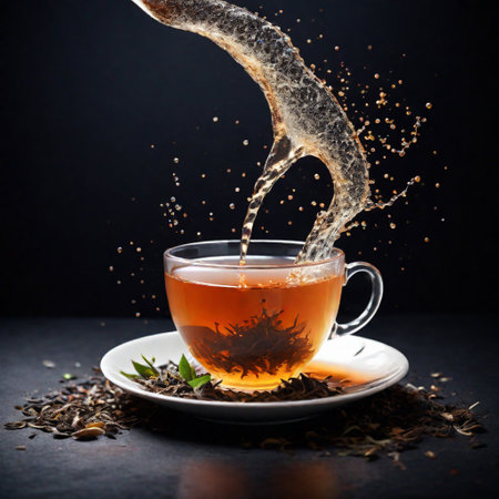Tea being poured elegantly from a teapot into a glass cup, creating gentle ripples in the liquid.