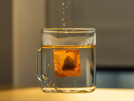 a simple tea bag floating in a clear glass mug, with hot water slowly turning golden as the tea infuses.