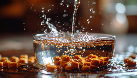 A dynamic close-up captures the moment hot water is poured into a glass bowl, causing instant coffee granules to erupt in a beautiful splash. The image conveys energy, preparation, and the simple pleasure of a morning ritual.