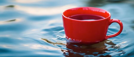A bright red cup is gently drifting on the surface of calm water under clear daylight. The ripples create a serene atmosphere, enhancing the vibrant color of the cup.