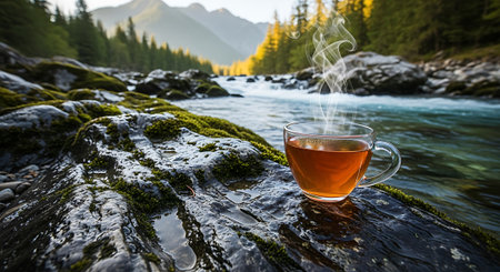 This serene scene features a steaming cup of tea placed on a mossy rock near a flowing river amidst mountains and trees.