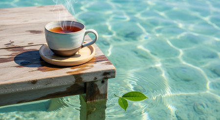 Steaming cup of tea sitting on a wooden dock beside calm, turquoise water with a green leaf floating peacefully by.