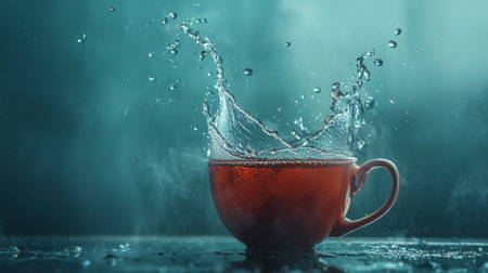 A dramatic capture of a tea splash in a red cup with dynamic water droplets suspended mid-air against a soft blue background.