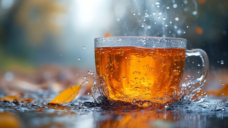 A mesmerizing splash of a hot beverage captured in a glass cup, showcasing golden hues and dynamic movement against an artistic bokeh backdrop.
