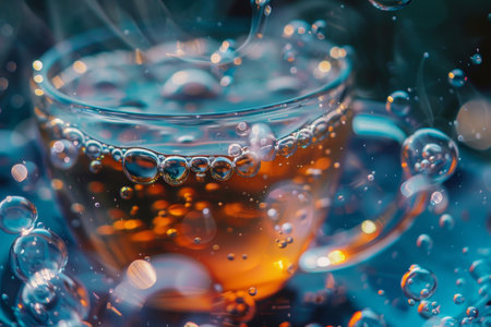 A close-up reveals a cup filled with golden tea, with bubbles forming on the surface, reflecting soft light during a tranquil afternoon.