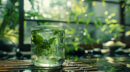 A glass of water with mint leaves on a wooden table near the window