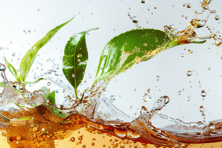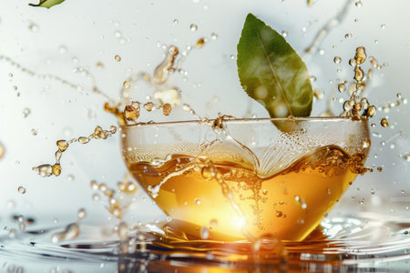 Cup of tea with splashes, drops and green leaves.