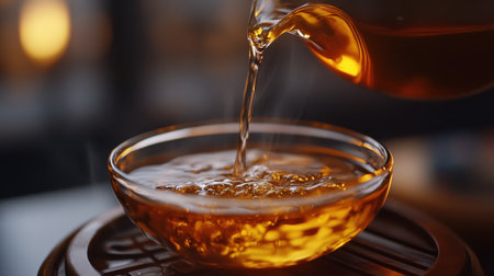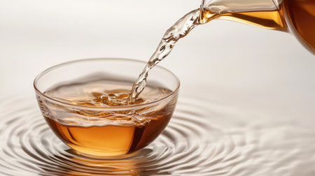A person carefully pours hot tea into a clear bowl from a teapot, creating ripples in the golden liquid against a warm, inviting backdrop.