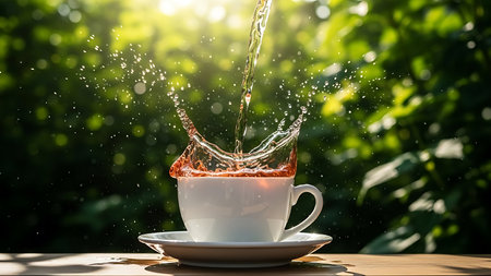 An action shot of tea being poured into a white cup, creating a dynamic splash against a blurred green forest background.