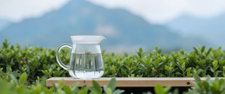 Pitcher of water on green tea plantation in the morning with mountain background