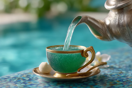 Moroccan mint tea is poured ceremonially from a silver teapot into an emerald cup. Elegant mosaic blur enhances the setting by a poolside. Concept of hospitality, culinary arts, cultural experiences.