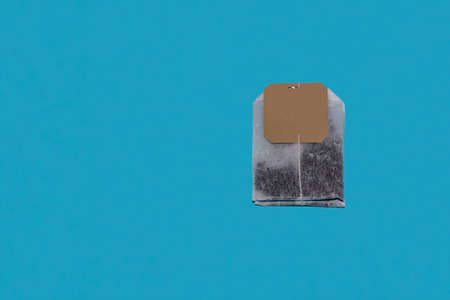 Tea bag with white label on string, blue background. Mockup for design, branding