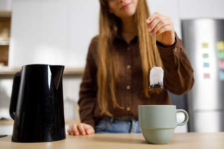Young woman making tea at the kitchen. Girl puts a tea bag into a glass. Black electric kettle on the table.