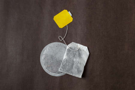 Teabags with yellow label. Top view, on a dark brown background. Mockup