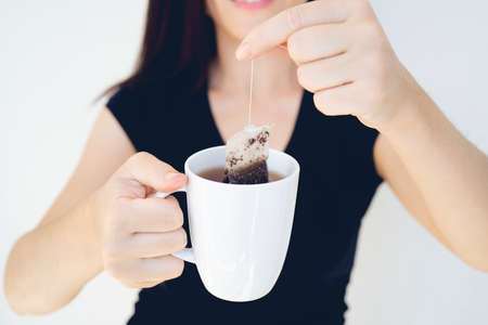 Hands of a young woman holding a cup. Herbal tea bag cup in hand on white background isolation