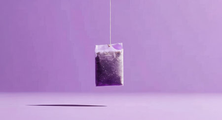 A solitary tea bag hangs by its string against a solid purple backdrop, casting a subtle shadow below.