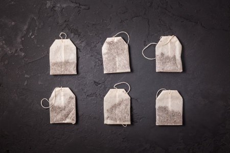 Assorted tea bags on black stone background