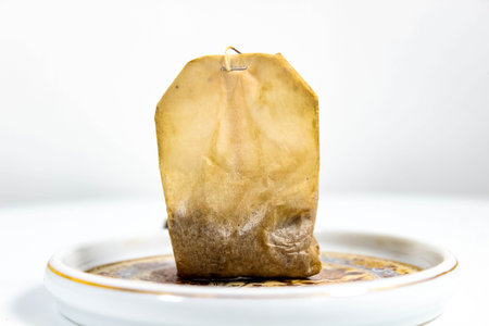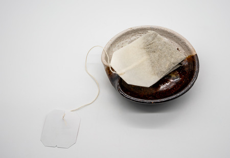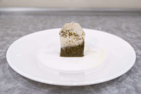 Used tea bag on a saucer. Selective shot. close-up