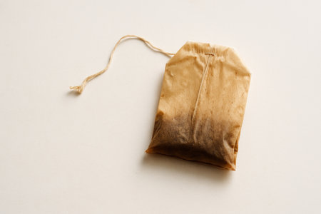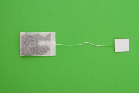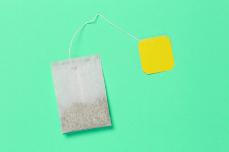 Tea bag on green table, copy space.