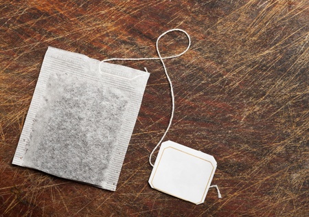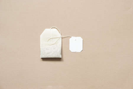 top view of teabag and blank white label placed on brown paper background