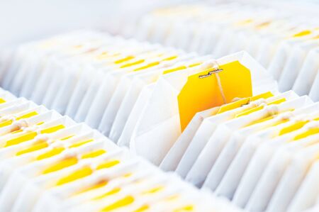 A set of teabags with black tea along the yellow background. Vivid concept of the tea party