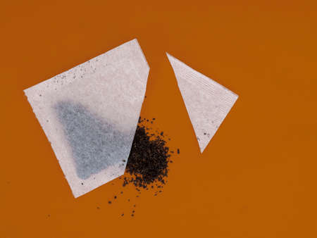 Tea bag sachet cut open to see contents and quality of leaves inside, on orange colour background.