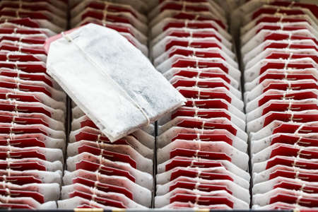 Close up tea bags with red labels in box