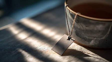 A tea bag hangs over a rustic cup, gradually infusing the water with rich color, creating a serene ambiance in the morning light.