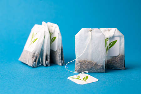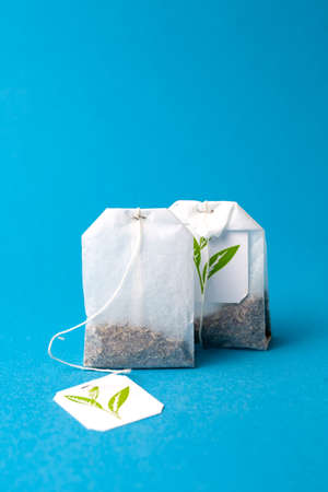 green herbal tea bags on a blue background.