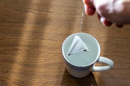 hand putting a pyramid tea bag in a hot water cup in the morning