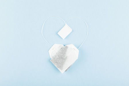 Tea bags in form of heart on blue