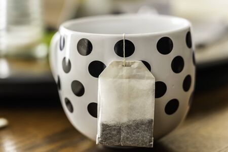 Polka dot tea cup with tea bag hanging outside it