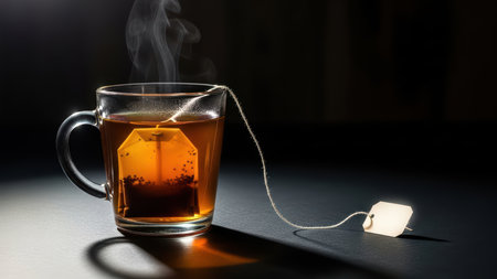 Steaming glass cup of black tea with tea bag on dark surface.