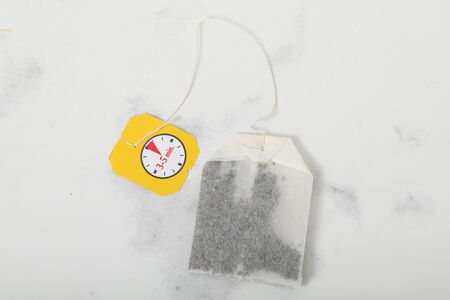 Close up black tea in teabag on white table background mock-up