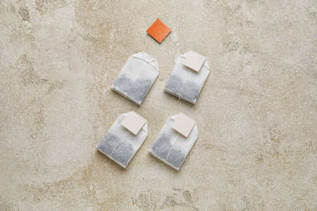 Tea bag with white label on gray table. Top view of tea bag. Blank free space for your advertising or text. Copyspace