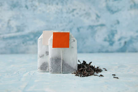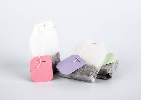 tea bags with white label isolated on light background, object