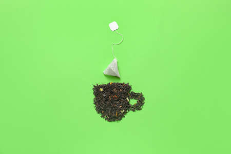 Composition with tea bag on color background