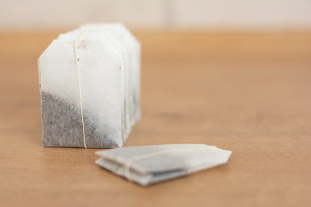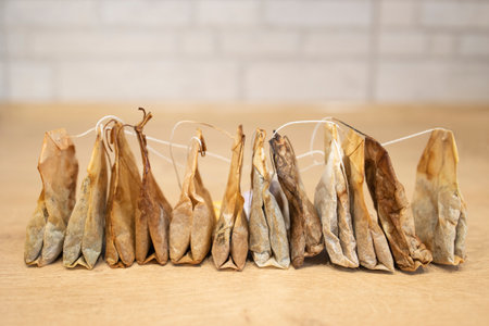 Used tea bags are stored in a row on a white and wooden background