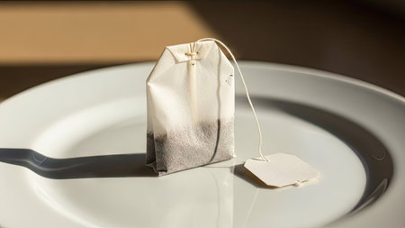 A tea bag rests on a white plate, illuminated by sunlight creating shadows. The composition features clean lines and textures, suggesting a simple, minimalist aesthetic. It could be useful for culinary, lifestyle, or health-related publications and marketing materials. The neutral color palette provides ample copy space.
