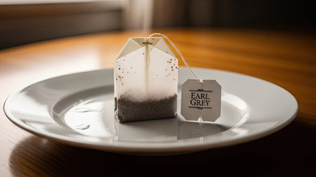 A close-up captures a tea bag resting on a white plate, placed on a wooden surface. The composition highlights the simplicity of the subject with soft lighting and a blurred background. The image could be used for illustrating articles about beverages, relaxation, or food preparation, suitable for diverse commercial applications.