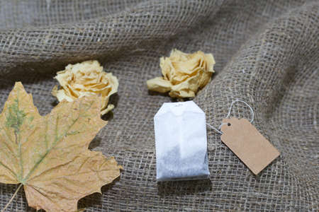 Dried roses and maple leaves on a rough linen cloth. Among them is a tea bag. Autumn still life.