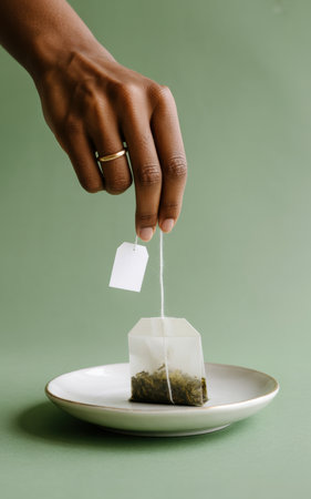 Hand gently dipping tea bag into white ceramic dish against a soft green background, highlighting herbal beverage preparation.