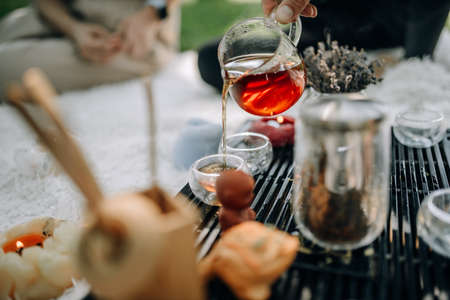 Traditional tea ceremony in the park. Pouring red tea into glass cups.