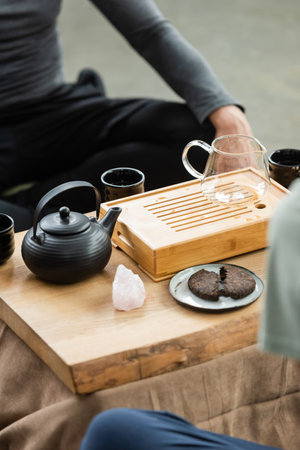 cropped view of compressed pu-erh tea near teapot and people in yoga studio