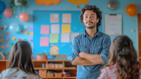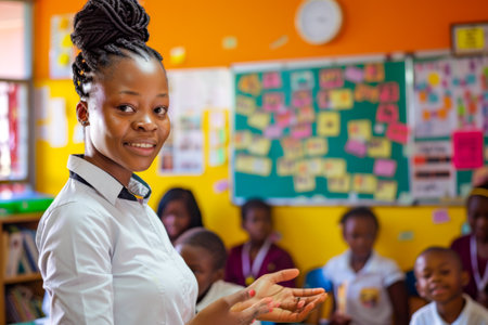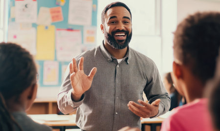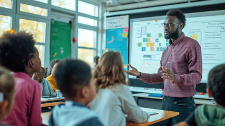 A teacher passionately explains concepts to engaged students in a vibrant classroom setting during a lesson.