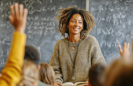 A teacher with curly hair discusses math with students eagerly raising hands in a busy classroom. The chalkboard is covered with complex equations and formulas.