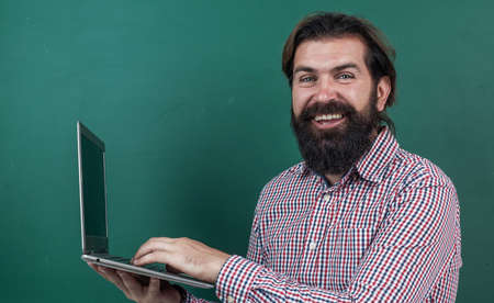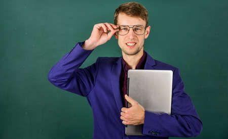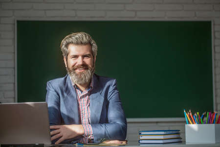 Portrait of confident male teacher in classroom. Young male teacher with laptop in class sits at the table the blackboard in the classroom. Teacher smiling at classroom at the elementary school