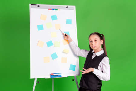 Photo of pretty clueless school girl wear black white uniform pointing white board stickers isolated green color background