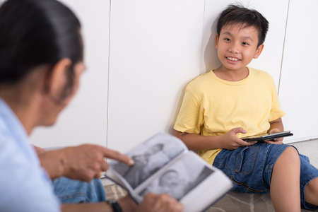 Vietnamese boy using digital tablet while his relatives watching photo album