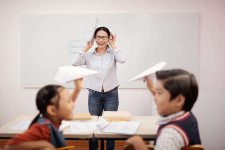 Generative AI : Smart woman teacher in glasses helping students to to schoolwork during lesson in light classroom at school